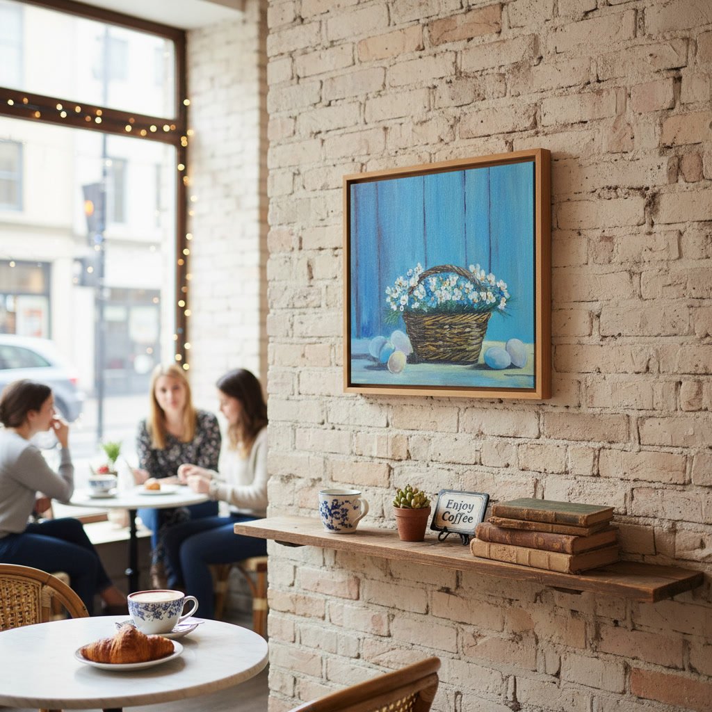 Bring a breath of fresh air to your home with this vibrant still life. Its calming blue tones and rustic blossoms create a peaceful, uplifting mood.